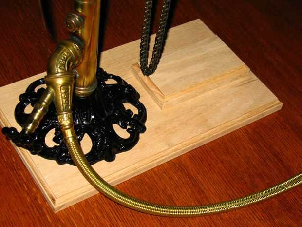 Construí una base de roble y enruta un borde decorativo de las piezas. Cortar una base más pequeña para el motor y pintado algunos latón de soportes "L" para montar el motor a él. Ensayo y Error me tiene la longitud correcta para la cadena, como poco a poco había reconstruido partes juntos. También he añadido la línea de suministro de agua trenzado, que es puramente decorativa.