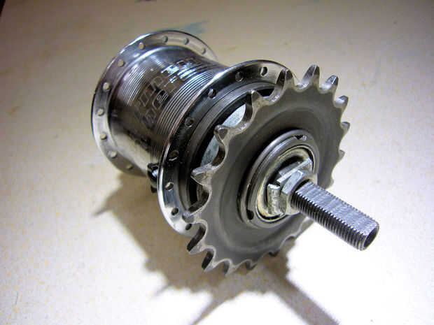 Eje de engranaje de tres velocidades Sturmey Archer. Esto está montado verticalmente de uno de los conrods y está suspendido de un solo extremo. La palanca de cambios para el eje se monta remotamente en la pared.