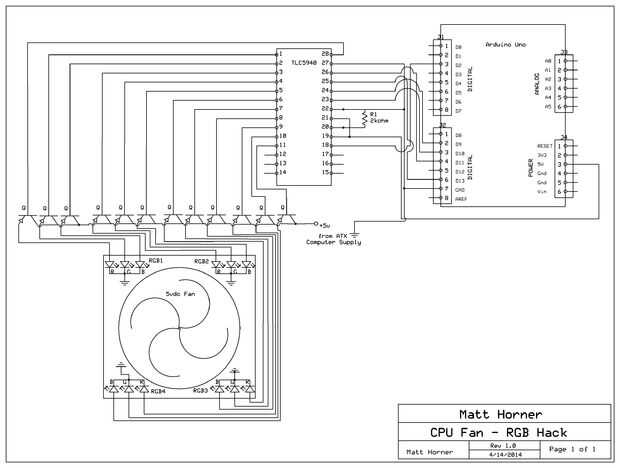 Aunque el esquema puede parecer complicado, la teoría es simple. Cada canal de salida PWM de la TLC5940 irá a la base de un transistor PNP. El colector de este transistor es atado alto, el + 5vdc salida de fuente de alimentación ATX de ordenador. El emisor de cada transistor es atado a un plomo solo del ánodo (+) de un LED. Repita este proceso para cada uno de los tres conductores del LED: uno para el rojo, uno verde y otro azul. Cada LED tiene tres transistores, controlados por tres canales PWM de la 5940. Esta misma lógica se aplica a todos los cuatro LEDs del ventilador. Cátodos de los LEDs (-) se ata bajo el suelo del equipo fuente de alimentación ATX.