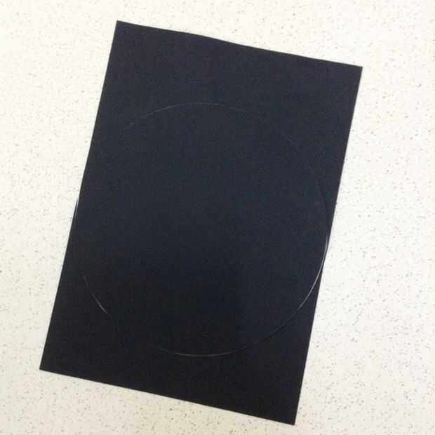 Utilizando la brújula, dibujar un círculo tan grande en la cartulina como quepan. Recuerde que el radio (igual que el palmo de la brújula) será la mitad del ancho del papel. Además, el centro del círculo se puede encontrar midiendo la mitad de la anchura y la mitad de la longitud del papel.