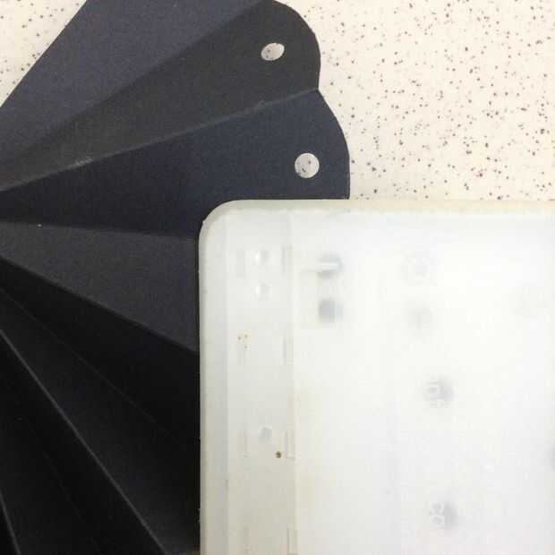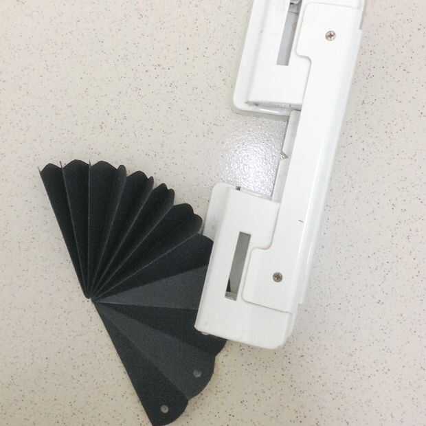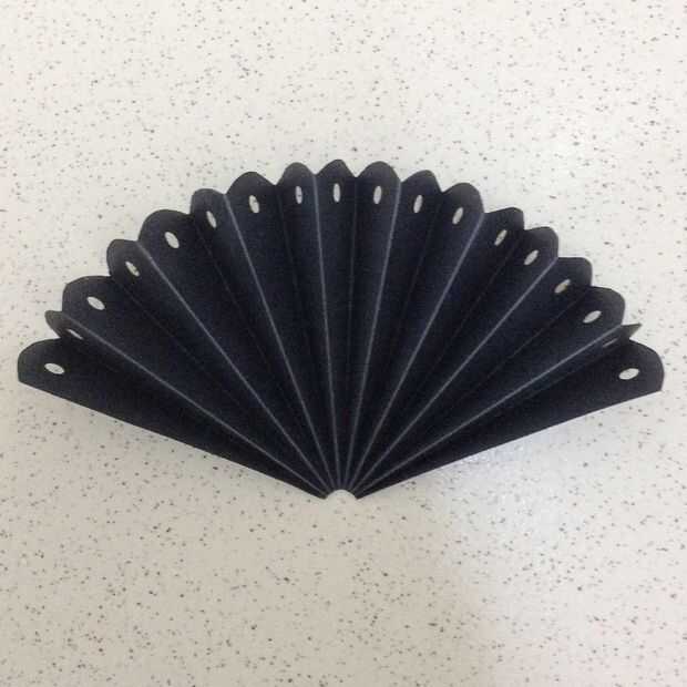Si lo desea, puede hacer agujeros dentro de cada "arco" con una perforadora. En mi perforadora, pude quitar la tapa en la parte inferior para exponer el orificio de perforación. Luego usé la punta de la brújula para penetrar completamente a través de los centros de los arcos. Estas perforan agujeros actuados como una guía cuando perforado los agujeros, permitiendo que todos los agujeros que encima de la otra cuando el ventilador se cerró.