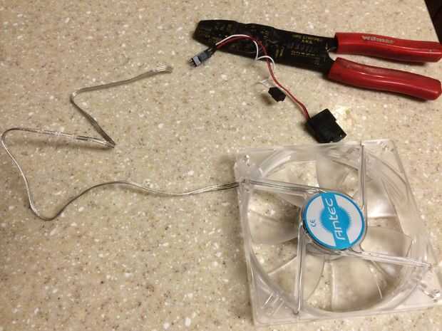 Corte los extremos del cable del transformador, así como los cables del ventilador. Asegurarse de que tiene un probador de corriente para averiguar de qué lado es el positivo (+) y negativo (-) de cable de tu transformador. El ventilador debe tener un rojo (+) y el cable negro (-), pero usted puede conectar los cables con unas tuercas para alambre y enchufe en para probar antes de usar un accesorio de alambre más permanente. Usé prensado estilo terminal cable conectores, para mantener una conexión en línea para alambre de más fácil ejecución.