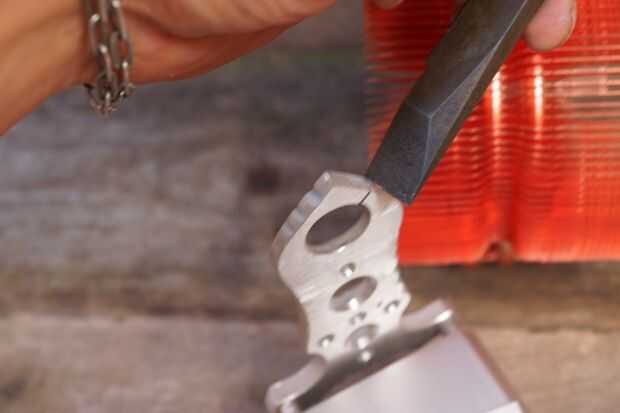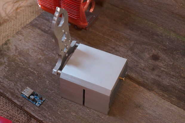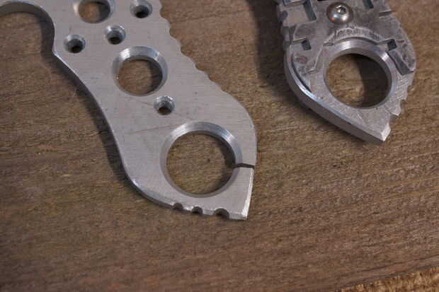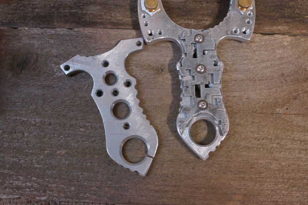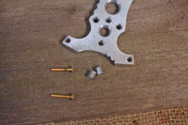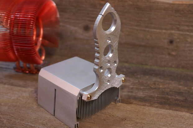 Tres orificios fueron intervenidos en el disipador de calor más baja. Dos en el frente del marco de tirachinas sujetar el fregadero. Uno en el centro de la espalda para una primavera que se entran en juego más tarde.