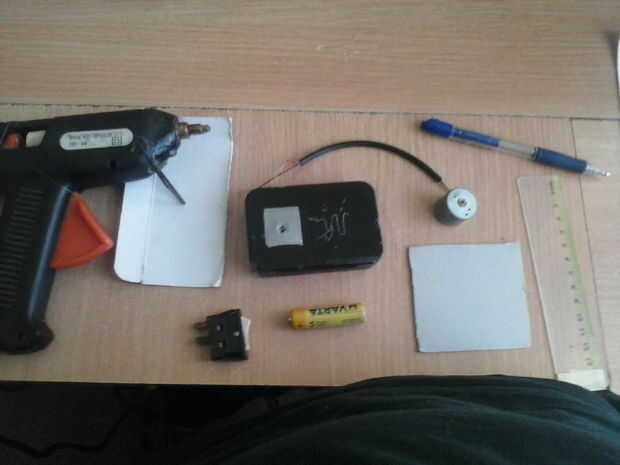 Paso 1: materiales Pistola de pegamento caliente Tijeras Caja de Altoids... (He usado una caja diferente) un pedazo de cartón 1 x batería AA interruptor Un pequeño motor (1.5v-3v) una pluma Cable eléctrico un pedazo de papel