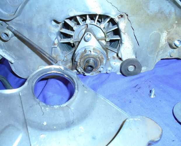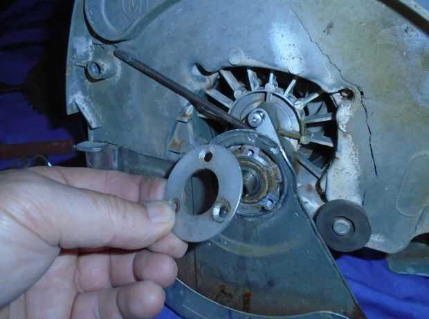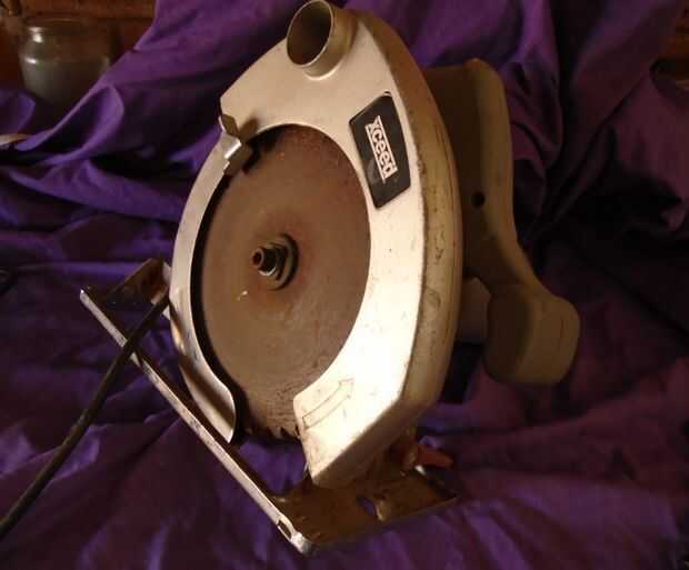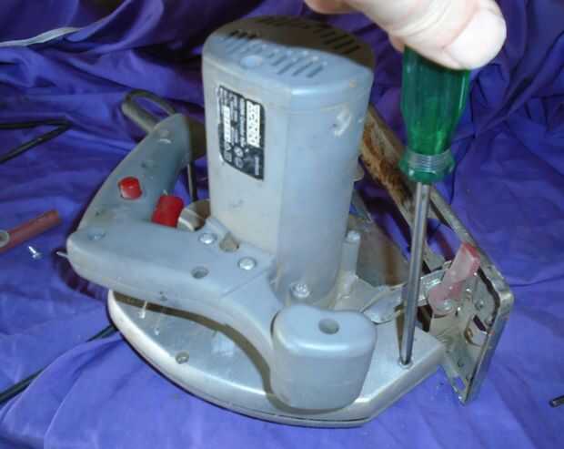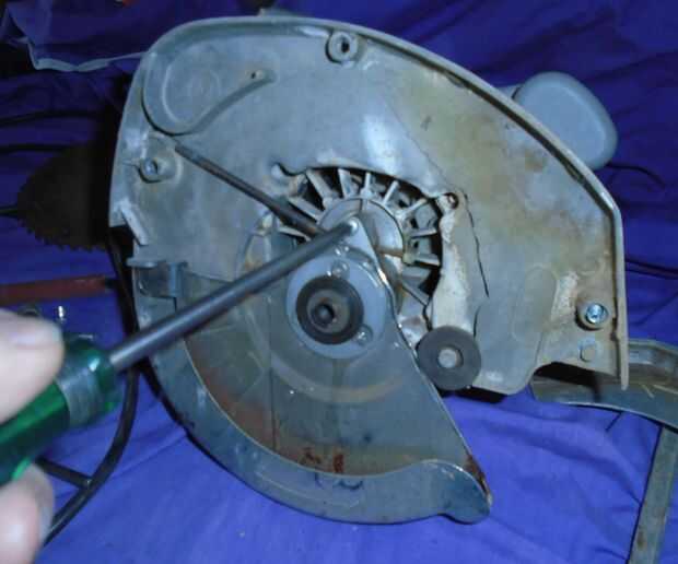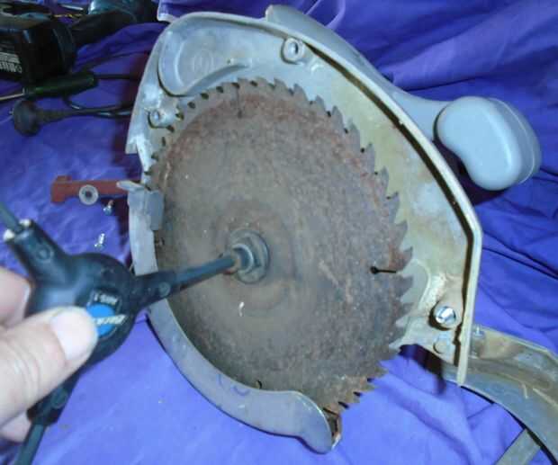 Después de confirmar que la sierra puso en marcha, aunque su bastante ruidosa, quité los guardias y la cuchilla. Esto no es difícil hacerlo sólo tres o cuatro tornillos, y luego quité el el protector retráctil y la primavera.
