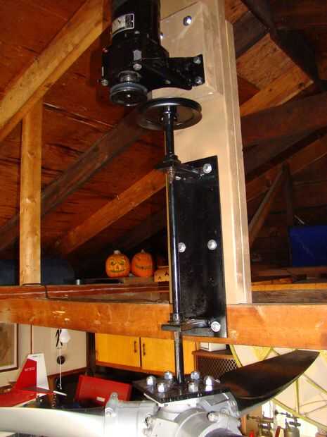 Quité la polea engranaje original. Montaje del motor pintado de negro, se gira 180 grados y montarlo. Entonces añadí una polea de correa trapezoidal de tres pulgadas. Estaba montado en el 2 X 8 arriba del soporte del propulsor, hacia abajo, por lo que los tres pulgadas polea en el motor alineado con la polea de seis pulgadas en el Monte de la hélice.