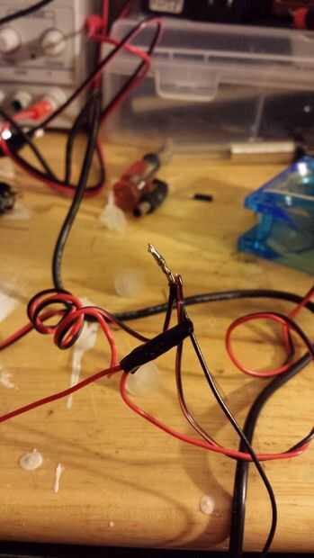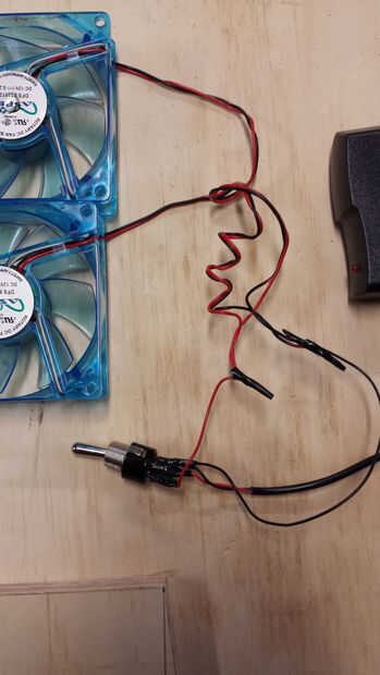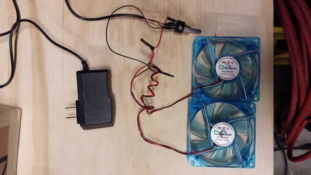 Después de haber quitado el enchufe de pared encontré los cables positivos y negativos y soldado al interruptor (Asegúrese de averiguar que son que las del interruptor de cambio si fueran sin etiqueta) junto con los cables positivos y negativos de los ventiladores como se muestra en el cuadro primero y segundo. Su una buena idea de hacer todas las conexiones con cinta primero antes de soldar para asegurar que todos los trabajos correctamente. Para conseguir el cable de alimentación en la caja, debe soldarse después de que todo esté en su lugar (o se puede quitar ese lado de la caja si no pegue). Los ventiladores están conectados al interruptor en paralelo por lo que los 12 voltios de adaptador de pared suministra 12 voltios a cada ventilador. Después de soldar envuelve cinta aislante alrededor de cada conexión.