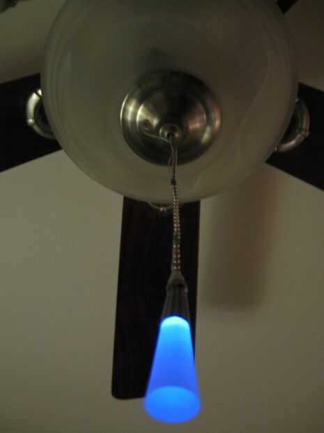 La fuente principal de iluminación para mi dormitorio es una lámpara de ventilador de techo. Mayoría de las veces utilizo el interruptor para encender y apagar la luz, pero a veces estoy más cerca del interruptor de cadena que va utilizar en su lugar. El problema es que la cadena puede ser imposible de encontrar en la oscuridad; a veces lo encontrará enseguida pero otras veces que lo paradójico mi brazo entero alrededor de sensación como un idiota tratando de localizarlo. Así que decidí hack aparte una luz accionada solar del jardín y utilizar su LED para hacer la manija de la cadena del resplandor. Cuando el circuito jardín de luz detecta la lámpara ventilador de techo apagado alimenta el LED con una batería. El circuito también recarga la batería cuando la luz está encendida a través de una célula solar.