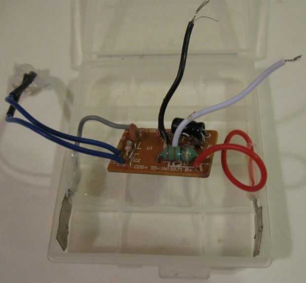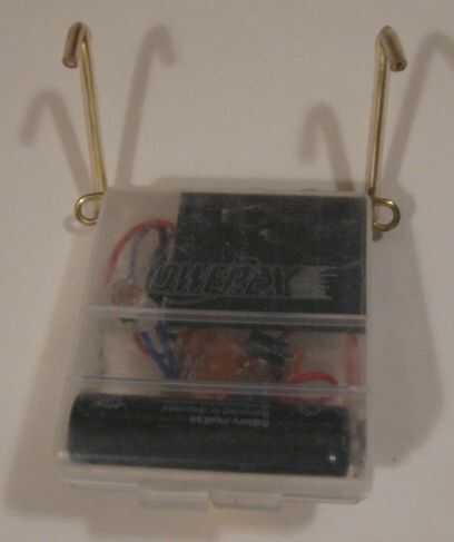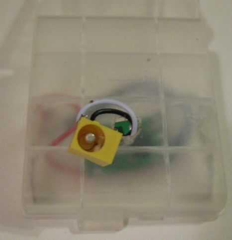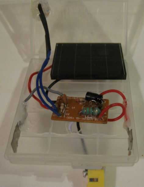 Para cerrar el circuito he usado un estuche de batería vieja, claro. Primero pegué los contactos de la batería a la caja. Lo hice con la batería en el circuito y el LED por lo que podría ser cierto que tenía los contactos en la posición correcta. Entonces había cortada lleva los LED por lo que pude insertar en la manija de la cadena en el paso siguiente. Después de moví cables de conexión de tablero de LED al otro lado del tablero y conectados a un conector de barril a ellos en la parte posterior de la caja de la batería. Esto permite que el LED a ser fácilmente conectado/desconectado a/desde el circuito. Luego separó cuidadosamente la célula solar del pegamento que enlaza a su titular. Entonces resoldered la célula solar a la Junta. Una vez tenía todo en su lugar inserta la batería, cerré el caso y caliente pegado el barril y unos ganchos de una percha de basura de la placa en el recinto.