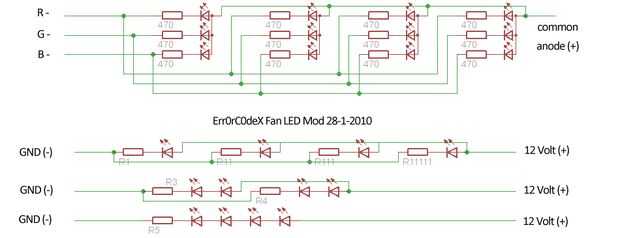 mejor utilizar 1 resistencia esto da como resultado menor corriente drenado de psu pero esto sólo puede hacerse con leds cual tiene una baja tensión como LED ' s rojos (1.5v 4 x 1.5 = 6v 6v < 12v).
