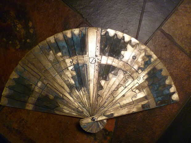 Mi esposa me pidieron para hacer un ventilador de steampunk creíble. Hemos decidido hacer de la hoja de cobre amarillo con un patrón de engranajes grabado al agua fuerte en la parte delantera. Ahora, lo confieso, estos engranajes son puramente decorativo, que es un poco contra mis valores. Pero al menos malla correctamente, tiene un perfil de diente razonable, y que se conectan en una serie que realmente tiene sentido. Así la ética de mi oscuro artífice fue suficiente creo. :)