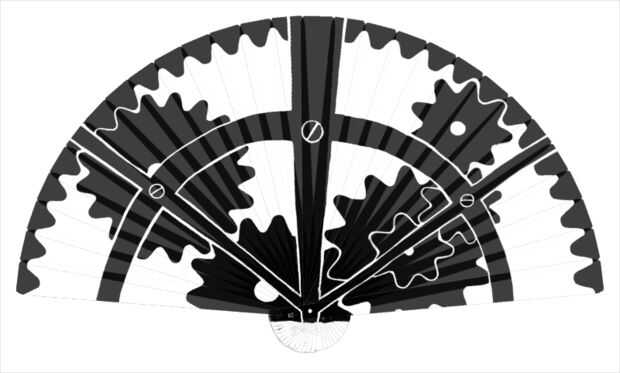 El primer paso para diseñar el patrón era simplemente sacar la forma del abanico desplegado, haciendo referencia a un fan de bamboo barato. Porque esto estaba destinado a ser grabada en bronce, fue dibujado en negativo. Negro áreas voluntad no grabarse, resultando en una zona elevada, brillante latón en el producto final. Áreas blancas serán grabadas, y por lo tanto el color más oscuro de la pátina que elegiste. También tenga en cuenta el arco sólido en el medio del ventilador. Esto fue agregado para ayudar a ocultar las líneas de monofilamento que unen el ventilador.