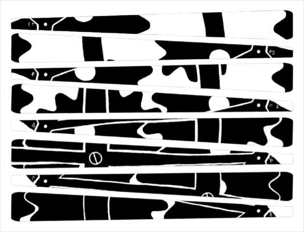 Medimos la forma de una sola hoja y dibujó en Photoshop, asegurándose de incluir el agujero del pivote en la parte inferior. 28 copias, cada una fue rotada por 6 grados más que el anterior uno. Éstos fueron utilizados para crear máscaras que cortan rebanadas de la imagen de diseño. El resultado final fue 28 patrones de hoja separada. En el diseño que he incluido aquí, subido la transparencia un poco para que pueda ver cuánto se superpone el diseño en hojas sucesivas.