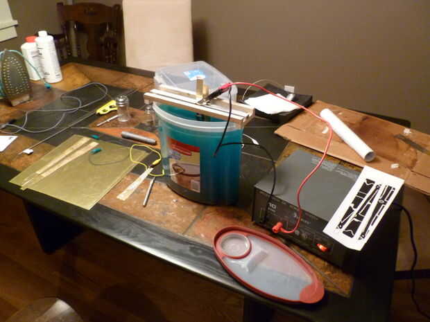 Este no era mi primer proyecto con grabado de latón, pero fue por lejos el más grande que había intentado. Decidí probar un proceso electrolítico, como había oído cosas buenas y no tener que comprar cloruro férrico era muy atractiva. Por desgracia, fue un desastre. La calidad de etch no era gran, y soplé continuamente fusibles en mi alimentación. Estoy seguro de que las personas están diciendo la verdad cuando dicen que es un buen método, pero no pude hacer que funcione.