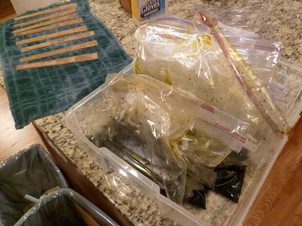 Después de luchar con electrolítico para cerca de 10 de las hojas, me cambié a cloruro férrico. Esto terminó siendo una buena decisión, mejorada por dos descubrimientos. Resulta que el cloruro férrico es considerablemente más barato en las casas de alimentación electrónica real (frente a Radio Shack o de Fry). También surgió una buena manera de grabar muchos módulos en paralelo. He pegado cada hoja en una bolsa separada y vertida en algunos cloruro férrico. Coloqué las bolsas dentro de una caja de plástico más grande, para servir como contención secundaria en caso de un pinchazo. (Cloruro férrico no es tóxico, pero tiñe como loco!) Esto también proporciona una manera conveniente para agitar la solución para la velocidad de grabado. Le aguanté la caja en mi regazo y activé mi pierna mientras mira TV. También simplifica la disposición. Cosas en toallas de papel hasta que se absorba todo el líquido, sellar la bolsa y lo tiran. Tipo de genio, si lo digo yo.