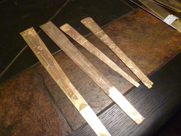 Así, sí, el problema con hacer 28 de nada es que lleva para siempre. Las cuchillas de corte después de que fueron grabados fue otro ejemplo de este problema. Originalmente planeé hacer con Sierra de joyero, pero que iba a tomar una media hora cada uno. Cada! En cambio, he tomado prestada esquileo del metal de un amigo en medio de la peor tormenta de nieve Seattle había visto en décadas y rugosa hacia fuera usando eso. Los bordes redondeados entonces fueron acabados con Sierra de joyero. Podría hacerlo con unas tijeras, pero asegúrese de obtener el tipo sin dientes.