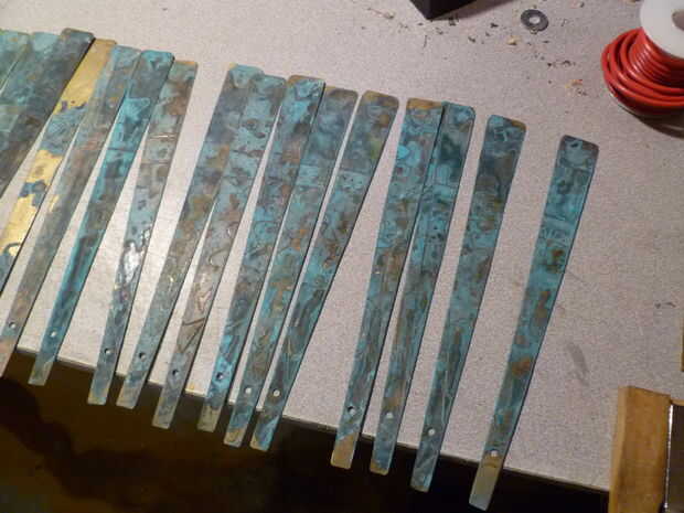Primero, las láminas debían limpiarse. Suciedad y los aceites pueden actuar como una resistencia, previniendo la pátina de la formación en las áreas. Después de todo este trabajo, no quiero una gran huella en el producto final! Normalmente lavo la parte en el fregadero, pero decidí que era más fácil, envíanos todos los 28 de ellos a través de la lavavajillas.