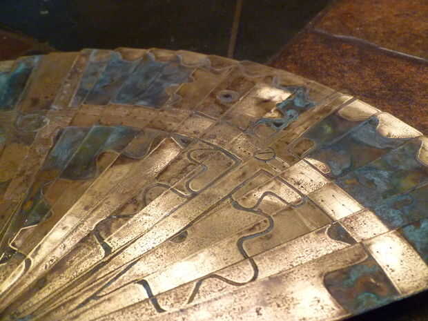 Una vez que todas las hojas tenían una pátina, enarenó ligeramente les con una lija de grano fino. Esto limpia la pátina la levantada, secciones, dejándolos en un bronce brillante. Las secciones inferiores, grabado al agua fuerte del diseño no tocadas y mantienen su pátina más oscura.