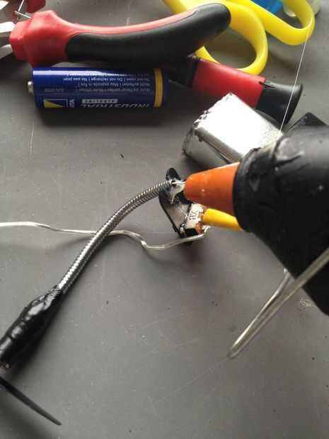Pegar las piezas y conecte los cables a la batería y el interruptor.