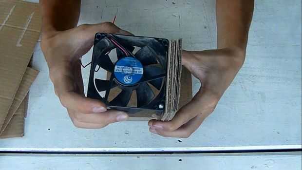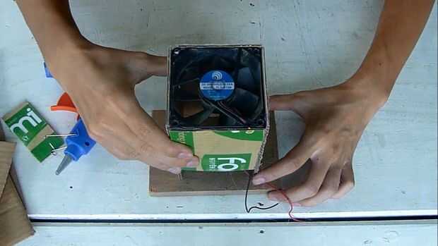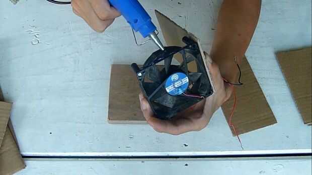 Utilice pegamento caliente, pegar estos fragmentos a 4 lados del ventilador peguen al tablero de madera