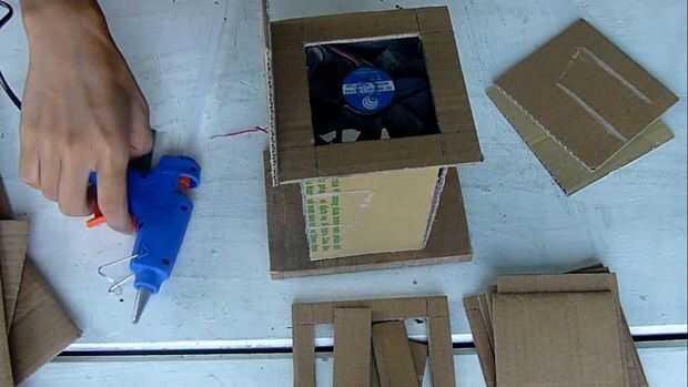 Utilice pegamento caliente para hacer el ventilador el aire apretado
