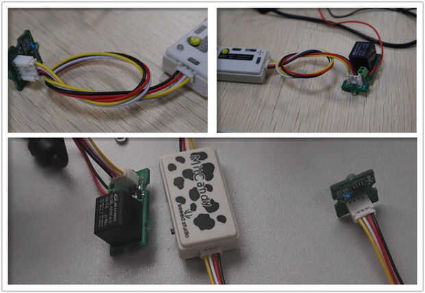 El sensor de temperatura, placa de relé y MilCandy son todos los miembros del sistema de plug-and-play de Grove. En este paso, encontrar dos cables de Grove para conectar todas las cosas. El "ojo" de la MilCandy, también conocido como sensor de temperatura, debe conectarse a la entrada de MilCandy. Y la "mano", también conocido como relé, debe conectarse al lado de salida de la misma. Entonces están listos para ir.
