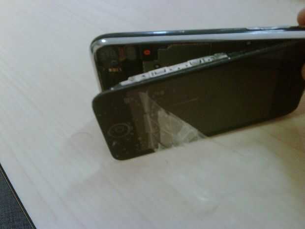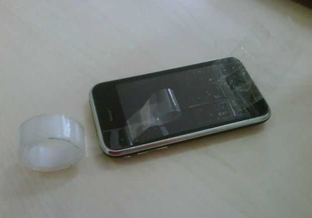 Ahora solo Pegue esas rayas en el cristal justo sobre el botón de inicio, firmemente agarrar los lados de metal del iPhone con una mano y comienzan a tire de la cinta con la otra. El más pequeño (inferior) el ángulo de tracción en relación con el vidrio, mejor el agarre.