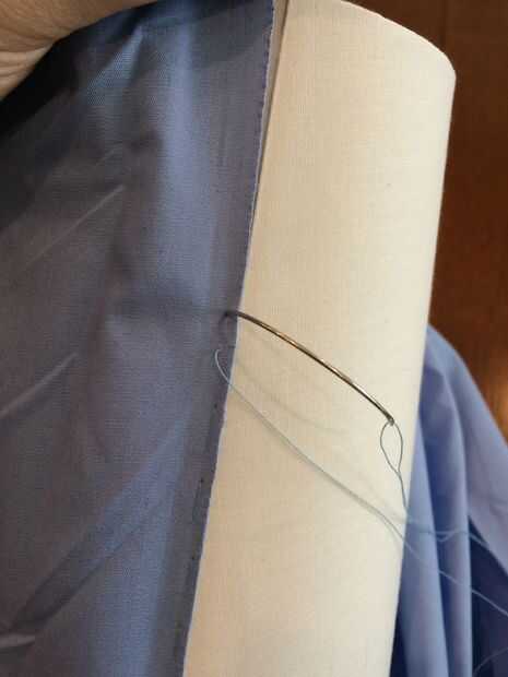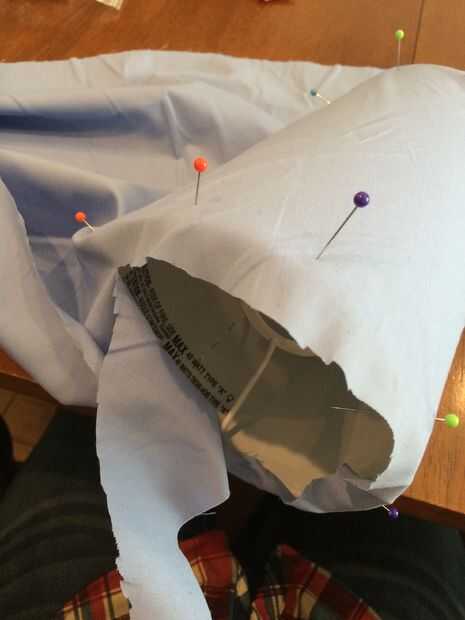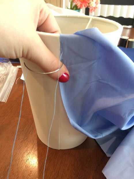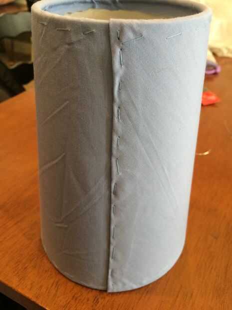 Para ello, Coloque el borde de la tela en el pliegue de la cortina de la lámpara y coser. Envuelva a la tela alrededor de la pantalla y tire firmemente. Utilice las clavijas para mantener a la tela en su lugar. En este punto puede cortar cualquier tela restante y sólo usar lo que usted necesita. No olvide tensar de vez en cuando para que la tela no está suelta en la pantalla. Coser alrededor de los bordes para cubrir el entero fuera de la pantalla. Para terminar este paso, coser la costura firmemente contra el principio de la tela.