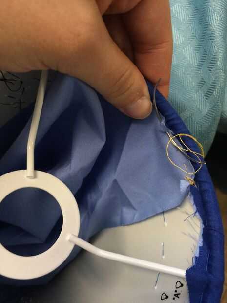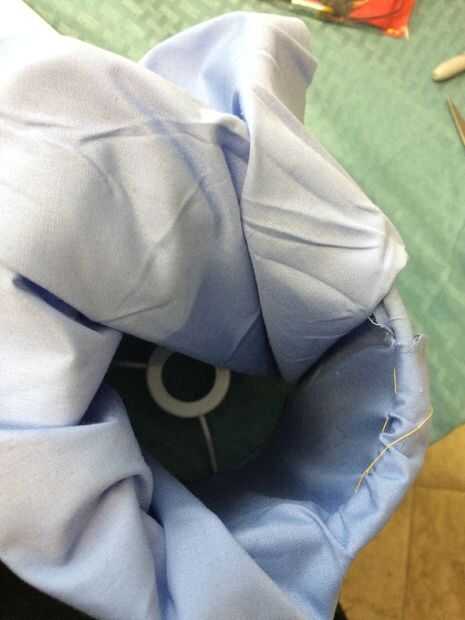 Para ello, Coloque la esquina de la tela azul clara en el borde de la lámpara y mueva lentamente a través de los bordes. Recuerde utilizar hilo azul claro. Estaba mal y se olvidó de cambiar mi hilo para que mía es de color amarilla. Repites este paso otra vez al final por lo que no importa lo bueno se ve, solo que funcione. Si ayuda, use los alfileres para sujetar a la tela en su lugar, tire firmemente de vez en cuando y corte tela extra cuando sea necesario. Una vez terminado con la parte superior de la pantalla, continuar hasta la parte inferior de la pantalla y arreglar esos bordes.