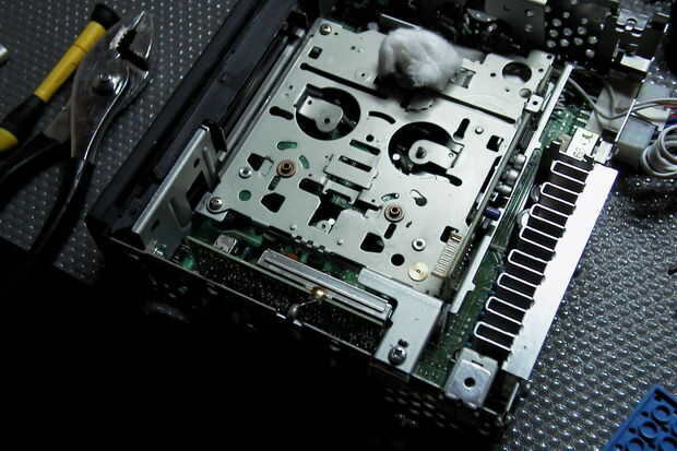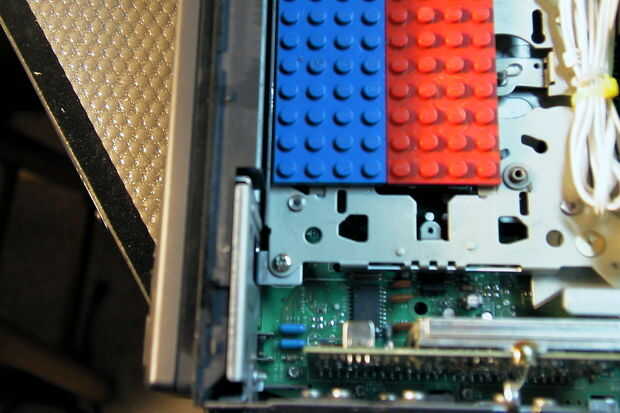 Pegué algunas placas de lego a la base del cassette. También presentar la cinta de apertura para dar un poco más de espacio para el iphone.