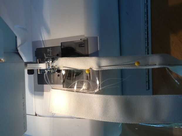 Doblar la cinta por la mitad colocando el vinilo entre.  Pin con cuidado y coser a lo largo de borde en zigzag.