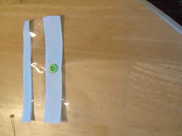 Recorte sobrante de la cinta.  Marque el centro de la cinta plana para la colocación del complemento. Instale el complemento. Se puede utilizar un gancho y cinta del lazo si no tienes las pestañas.