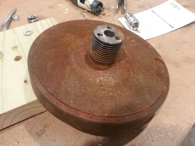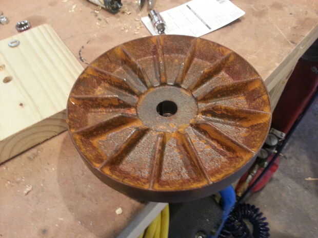 He leído que un montón de cosas malas sobre las láminas de turbina hechos del tubo de PVC rompiendo y decidido que me compraría un conjunto de hojas de aluminio brillante. Seis hojas de 15 pulgadas me cuestan cerca de $20 y me dieron un turbina que mide alrededor de un metro de diámetro. Tenía un motor de cinta de imán permanente CC. Parece estos motores tipo y algunos alternadores de automóvil selectos son lo que mayoría de la gente utiliza en sus aerogeneradores. Todo esto parecía bastante simple y fácil, hasta que descubrí las roscas de mano izquierda impar del tamaño del motor de la cinta. No he podido encontrar una tuerca en cualquier lugar que cabría esa cosa. Una revisión de los recursos de internet demostró que todo el mundo con un motor de caminadora que resolver este problema, pero nadie que vi eligieron para compartir cómo lo hicieron. Para solucionar este pequeño problema decidí acabo taladro y aprovechar los agujeros en el volante de hierro fundido grande en el motor y usarlo como un centro para las cuchillas. Esa idea fue abandonada rápidamente cuando descubrí que el volante tenía 13 aletas de metal muy gruesas en su parte posterior. 13 aletas significa también hay 13 puntos planos. No había manera dividir los 13 puntos planos y el espacio uniformemente cualquier número de hojas en él (distinto o 13). No importa cómo he intentado lo que me iba a tratar de perforar y toque uno de esos con chorro de aletas. Sin una tuerca para el eje y un volante que no podía utilizar como un centro que decidí comprar un concentrador de acero plano (otro $15) y modificar el volante que podría utilizar como una tuerca.