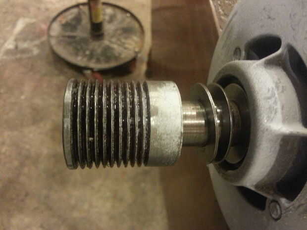 Atornilladas las láminas de turbina en el buje acero compré y poner todo el conjunto del motor sólo para descubrir que otro problema. Cuando aprieta la tuerca contra el cubo trabó el cubo contra la caja del motor. Para resolver este problema que pedí 6 especial 17mm diámetro x 1 mm de espesor empuje arandelas ($3) de Amazon y utiliza como espaciadores entre el cojinete del eje del motor y el eje de la turbina.