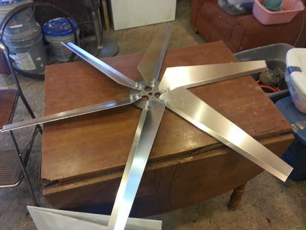 Nota añadida: que había leído que las hojas menos pones en una turbina el RPMs más dará vuelta. Dicen que lo ideal es una hoja. He probado 3 cuchillas pero tardó 12 mph vientos para comenzar la cosa girando. Cuando fui a 6 láminas comenzó rodaje en alrededor de 5 mph. Si alguna vez tengo que tomarlo abajo puedo ir a 12 hojas así que una suave brisa convertirá it
