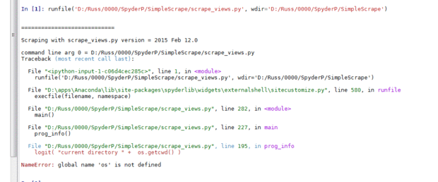 Errores serán registrados ( views.log ) otros sólo se mostrarán en la consola de Python. Spyder ofrece el ambiente más amigable para hacer frente a errores, otra vez fuertemente sugieren usarlo (otra vez). Cuando se ejecuta en primer lugar puede tener errores debido a los componentes que faltan en su entorno Python, Python se quejará a la consola.