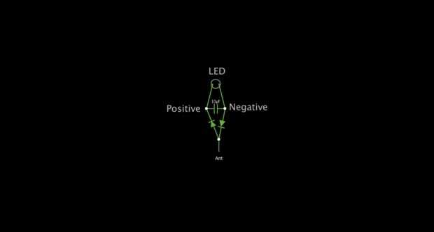 Primer diodo va al positivo del condensador. El segundo diodo proviene de la negativa del condensador. Se conectarán las otras piernas de los diodos. Lado pata larga del LED va al positivo del condensador y corto va al negativo uno.
