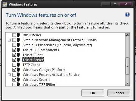 Desplácese hacia abajo hasta encontrar "Cliente Telnet" y "Servidor de Telnet" y asegúrese de que ambos son marcadas. Haga clic en "Aceptar" cuando termines.