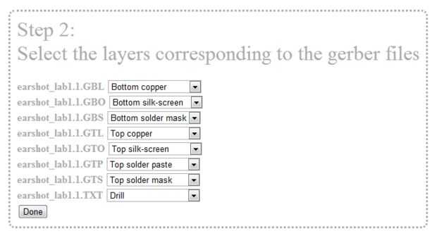 Una vez que has lanzado al espectador, verás un lugar para arrastrar y soltar los archivos Gerber. Fuera de tu navegador, abra la carpeta en el ordenador donde los archivos Gerber se encuentran y arrastrarlas a la ventana del navegador. Una vez hecho esto, se mostrarán los nombres de archivo. En este punto, usted debe decirle al espectador lo que representan los archivos. Si usted utiliza cualquiera de las extensiones más comunes de Gerber, hay una buena probabilidad de que el espectador detectará Cuáles son los archivos. Si hay archivos que no sabe qué hacer con, utilice los menús desplegables que le informe de lo que es cada archivo.