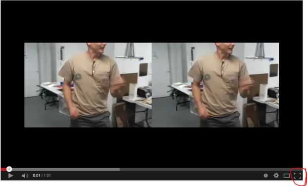 Seleccione modo de pantalla completa haciendo clic en el icono de un círculo por encima de la esquina inferior derecha. Ahora reproducir el vídeo y disfrutar la experiencia 3D! Nota Si la izquierda y derecha se intercambian el vídeo se verá raro. Volver al paso anterior y elegir "Cambiar (derecha-izquierda)" en el menú "Opciones".