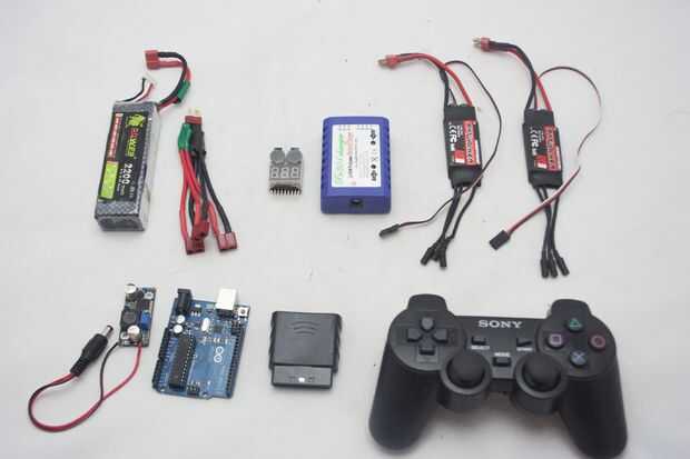 Ahora, comenzar a montar el aerodeslizador. Revise todas las partes, incluyendo el plástico formado hecho anteriormente dos ventiladores sin escobillas, dos controladores de velocidad electrónicos, una placa Arduino, una caja de pilas, un transmisor de ps2, varios cables y un soplador de aire.