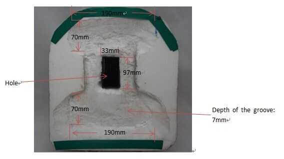 en un tamaño y forma para hacer el cuerpo principal de un aerodeslizador. El plástico de la espumado debe ser largo, 260 mm 230 mm de ancho y 20 mm de espesor. Por otra parte, cavar un agujero en el centro de la pieza de plástico que se ponga un ventilador más adelante y cavar un surco en la parte inferior del plástico para formar un colchón de aire. Las dimensiones y la forma de la ranura se muestran en las figuras a continuación 2.