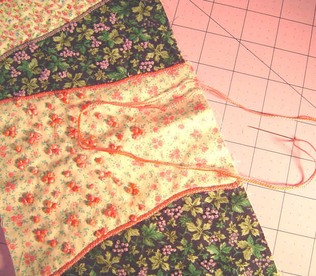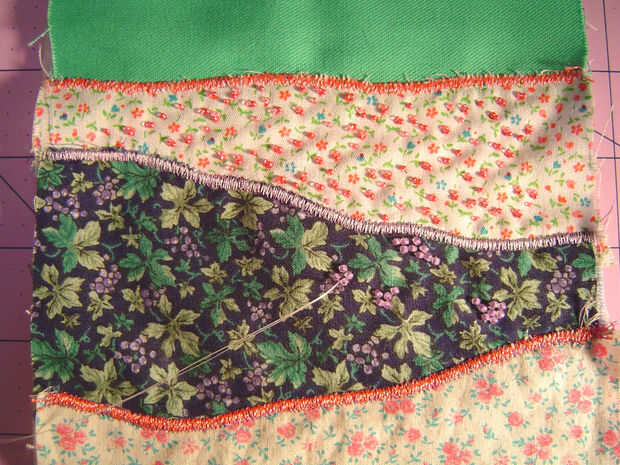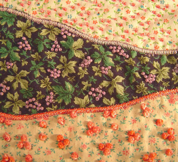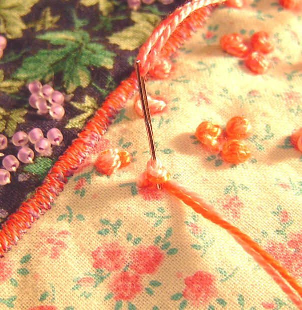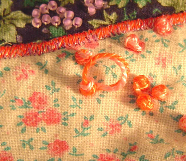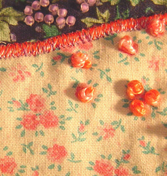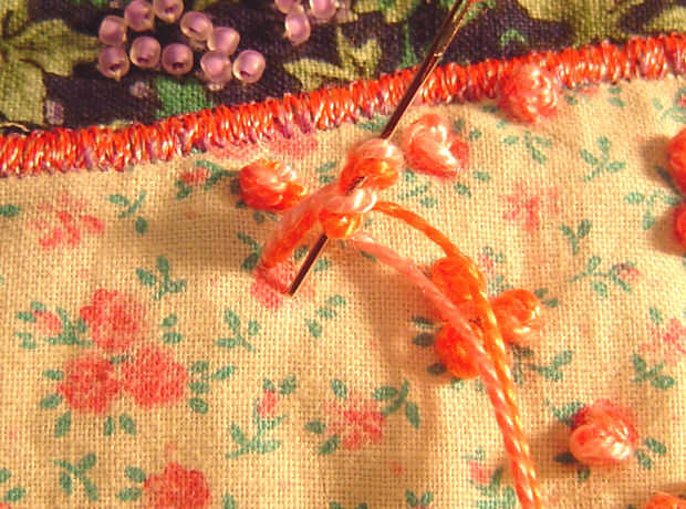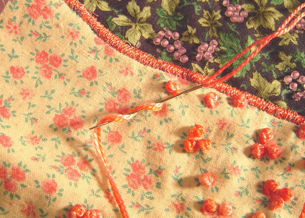 Ahora, comenzar a coser el bordado y granos. Utilicé size15seed diminutos granos para las flores de rojas y rosas, granos de la semilla púrpura de las uvas y doble algodón de perle para las rosas de nudo francés en la parte inferior. No adornan demasiado cerca a la línea de costura. Volver después de que las costuras se cosen y completan el trabajo.