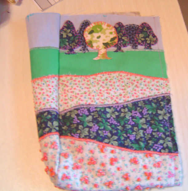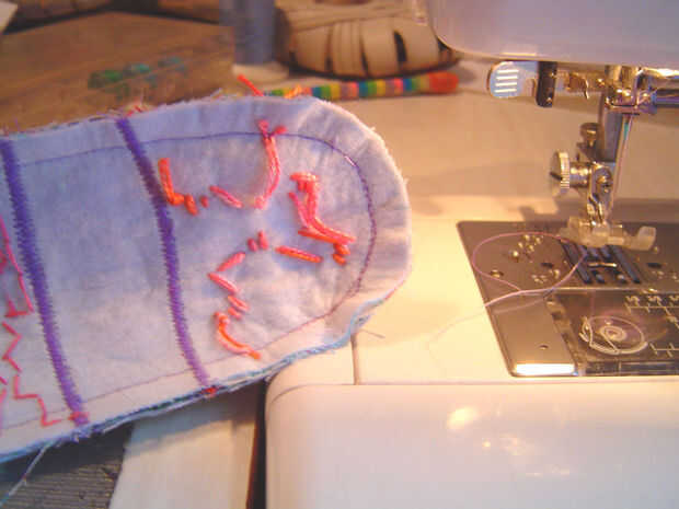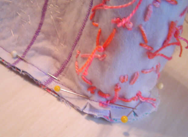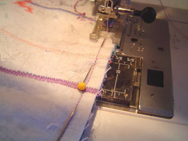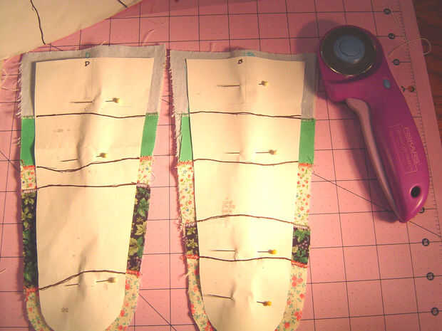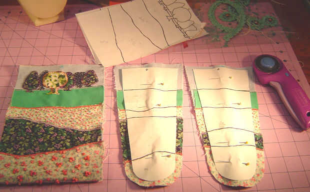 Cuando todas las piezas están adornadas, coloque los patrones en cada pieza y corte cuidadosamente alrededor de patrón. Coser 1/4" a lo largo de cada borde largo de la bolsa. Usted tendrá a la costura para facilitar en el extremo inferior de la bolsa. PIN y coser el bolso.