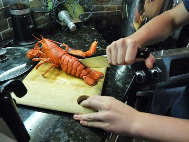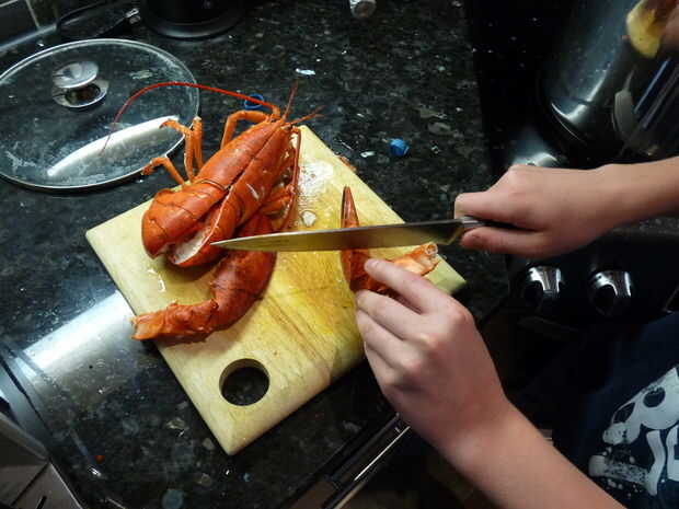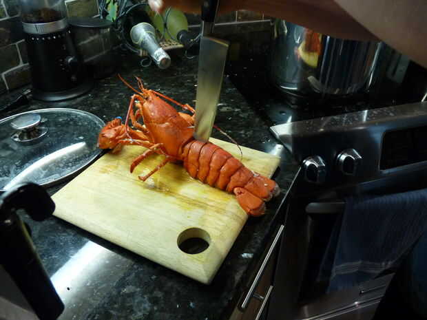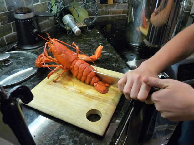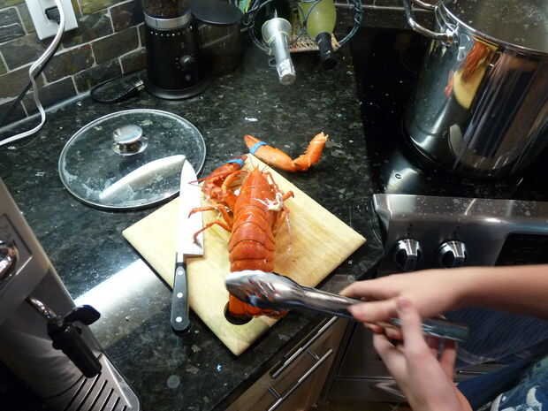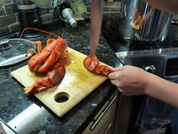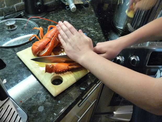 Esta es la parte que toma fuerza. Saca la langosta de la olla, sacudir el exceso de agua y lo coloque en un tablero de corte mirando hacia fuera. Tome su gran cuchillo y colocarlo en la base de la cola, con la punta entre las dos placas. A continuación, presione hacia abajo para rebanar a través de la cáscara. Seguimiento por el resto de la cola de la corte por la mitad. Después de hacer esto, quite las garras girando y tratar de romper la cáscara en los nudillos y las garras. La carne de garra sabe mejor, así que usted querrá asegurarse de que se puede acceder a ella.