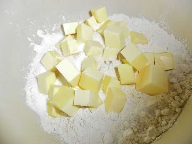 Cortar la mantequilla en trocitos. Añadir la harina, el azúcar y la mantequilla en un tazón grande.