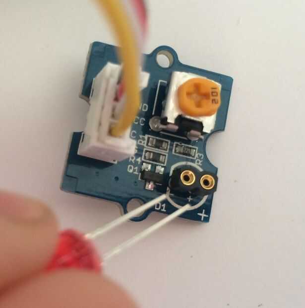 Primero pongo un uno de los LEDs no el socket del LED. Los dos cables salen del LED, el ánodo y el cátodo. Si te fijas bien en el borde inferior del plástico del LED, se aplana un lado. El alambre de ese lado es levemente más corto... que es el cátodo. El cable más largo en el lado redondo es el ánodo, que tiene que ser enchufado en una toma en la + lado (y no te preocupes si lo pones en mal--no romperá nada, la luz simplemente no se enciende). Entonces conecté el enchufe LED un puerto digital de la pantalla base.