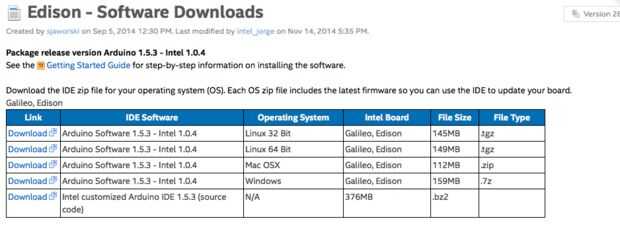 El tablero de Edison de Intel no es un Arduino, pero es Arduino compatible--para controlarlo tienes que descargar el IDE de Arduino (IDE = entorno de desarrollo integrado). Usted no necesitará aprender programación (todavía), pero necesita este software para hablar con el controlador. Seleccionar el archivo para su sistema operativo de la mesa en la parte superior. Tengo un Mac, por lo que las siguientes instrucciones son para el MacOS. Los usuarios de PC o Linux pueden seguir a la guía de Intel.