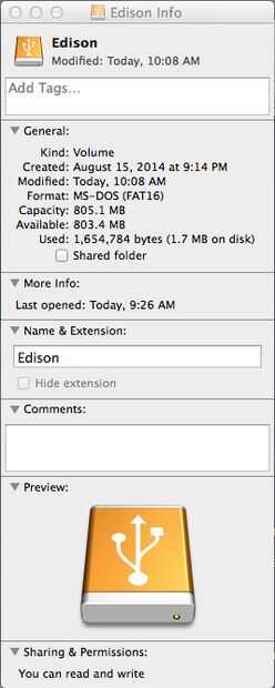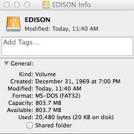 Ir a su escritorio y seleccione la unidad de Edison, y elija en el menú superior archivo > obtener información (o pulsa "comando" y "i" al mismo tiempo). Si el formato es MS-DOS (FAT16) tendrá que cambiar, así que siga con sangría instrucciones: