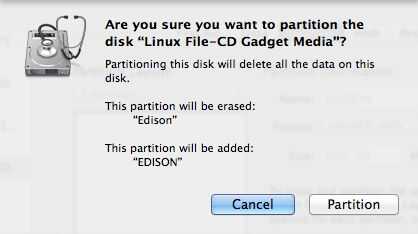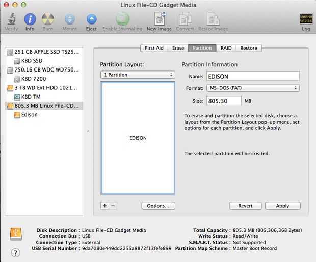 Abrir la aplicación "Utilidad de discos" (en aplicaciones > Utilidades). A la izquierda, seleccione 805.3 MB Linux archivo-CD y luego la pestaña "Particiones". El diseño de partición predeterminado es "actual" y no se puede modificar. Seleccionar "1 partición" en el menú desplegable diseño de particiones, y usted será capaz de cambiar el nombre (ser original, lo llaman Edison) y formatearla como MS-DOS (FAT). Este formato con FAT32... ¿Confundido aún? Cuando has hecho todas las selecciones derecho, pulsa "Aplicar"
